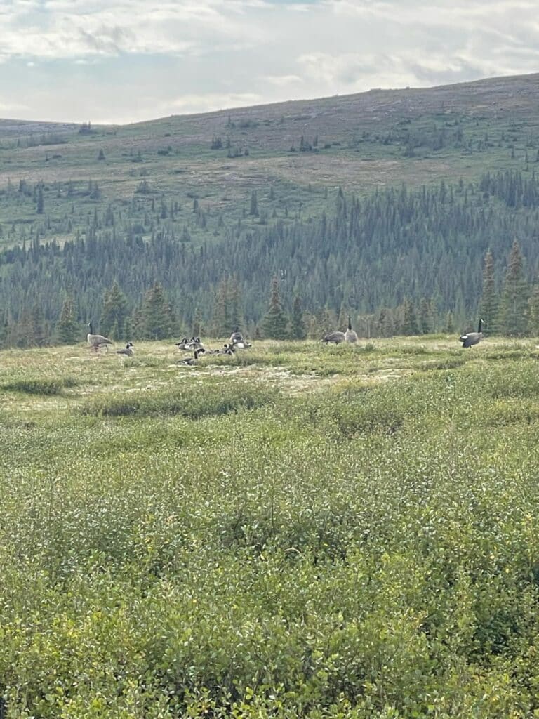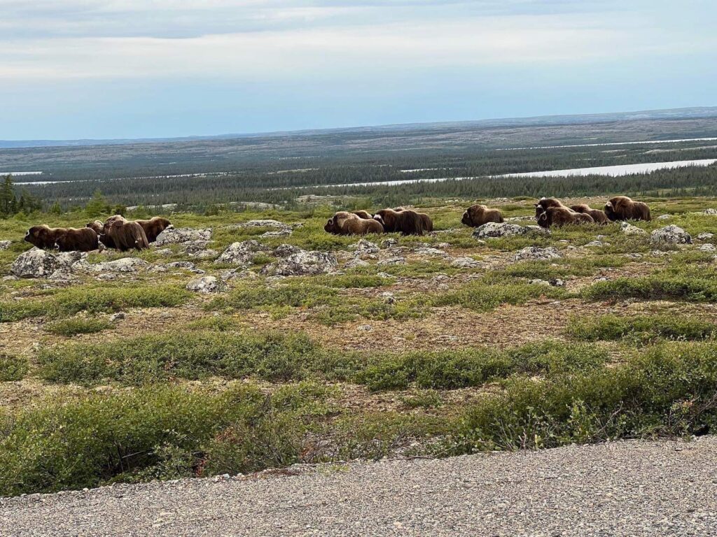 Quelle que soit la direction que vous décidez de prendre, vous pouvez vous attendre à profiter de l'observation de nombreuses variétés de flore et de baies aux couleurs vives, ainsi qu'à la possibilité d'apercevoir des animaux sauvages tels que des caribous de la harde de la rivière George, des ours noirs, des loups gris et arctiques, des renards, lemmings, lagopèdes et tétras.  Une récente découverte d'un petit troupeau de bœufs musqués a été repérée il y a seulement