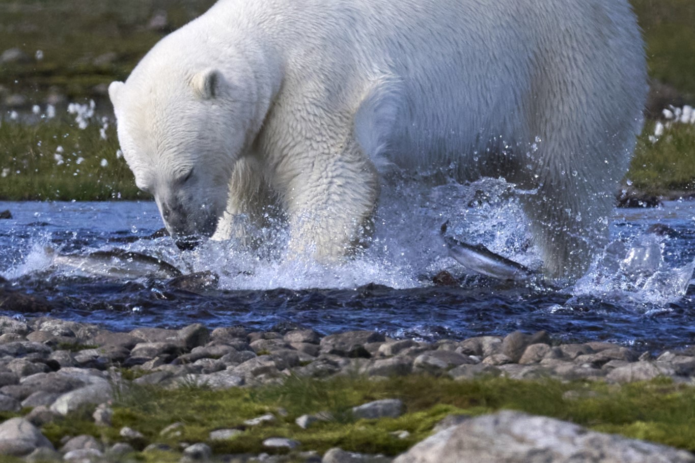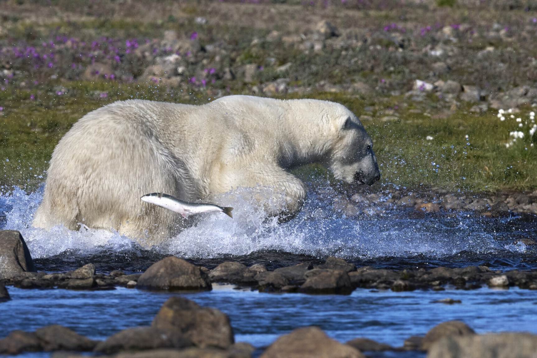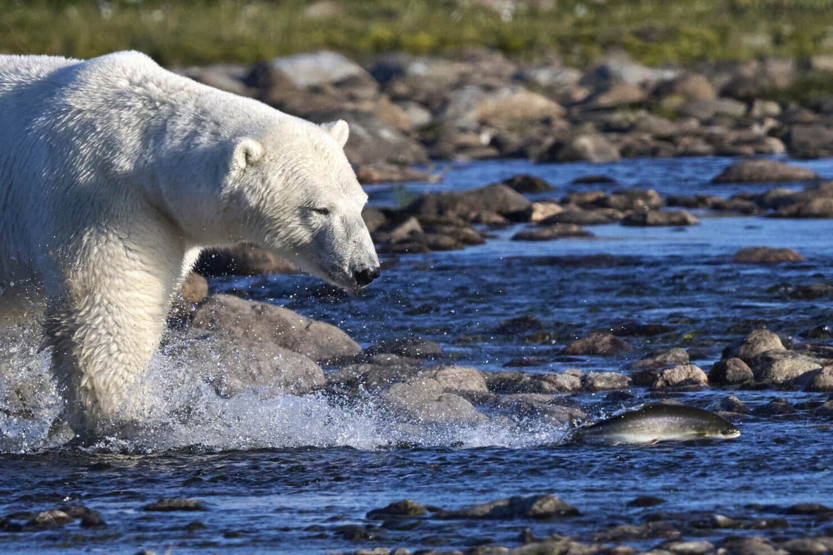 Des ours polaires, des ours noirs et parfois même des loups viennent pêcher dans les eaux claires et peu profondes. Ce spectacle faunique impressionnant se produit généralement à la fin de l’été arctique, vers la mi-août et début septembre, est une expérience à ne pas manquer. Crédit photo: Fabrice Simon