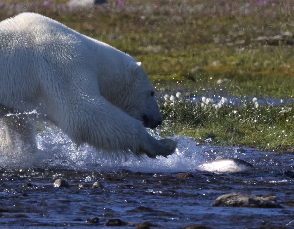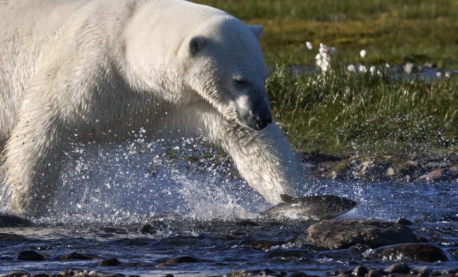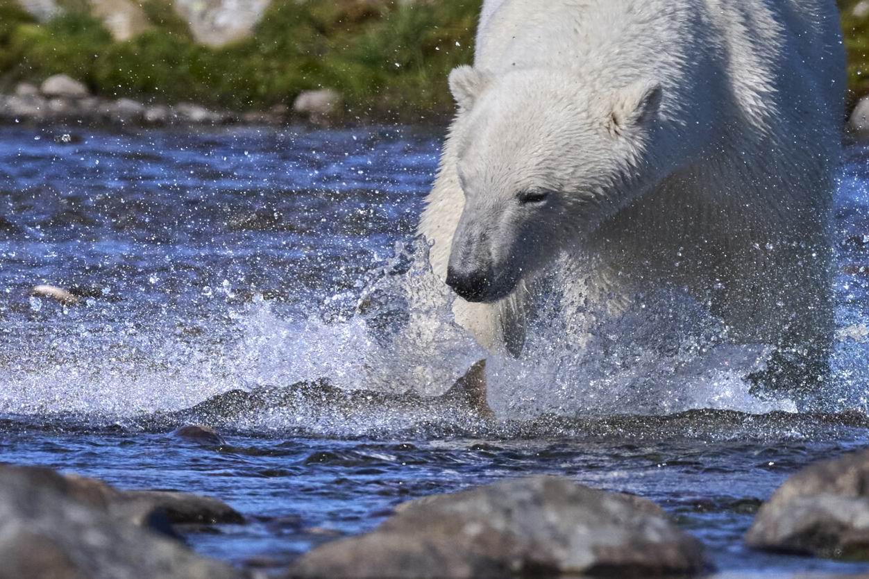 Des ours polaires, des ours noirs et parfois même des loups viennent pêcher dans les eaux claires et peu profondes. Ce spectacle faunique impressionnant se produit généralement à la fin de l’été arctique, vers la mi-août et début septembre, est une expérience à ne pas manquer. Crédit photo: Fabrice Simon