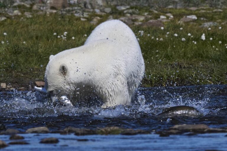 On the Quebec-Labrador peninsula, polar bears have developed a unique behavior in the world; they congregate in rivers to catch arctic char that swim upstream to spawn.